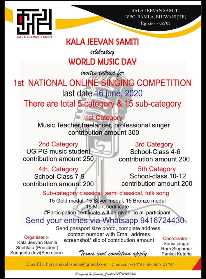 हरियाणा कला परिषद, हिसार और कला जीवन समिति दिनांक 29-09-2022 को राज्य स्तरीय सांझी प्रतियोगिता आयोजित करने जा रही है (स्थान : GOVT. मॉडल सीनियर सेकेंडरी स्कूल हांसी) अधिक जानकारी के लिए यहां क्लिक करें और पंजीकरण के लिए 8222837279 पर कॉल करें