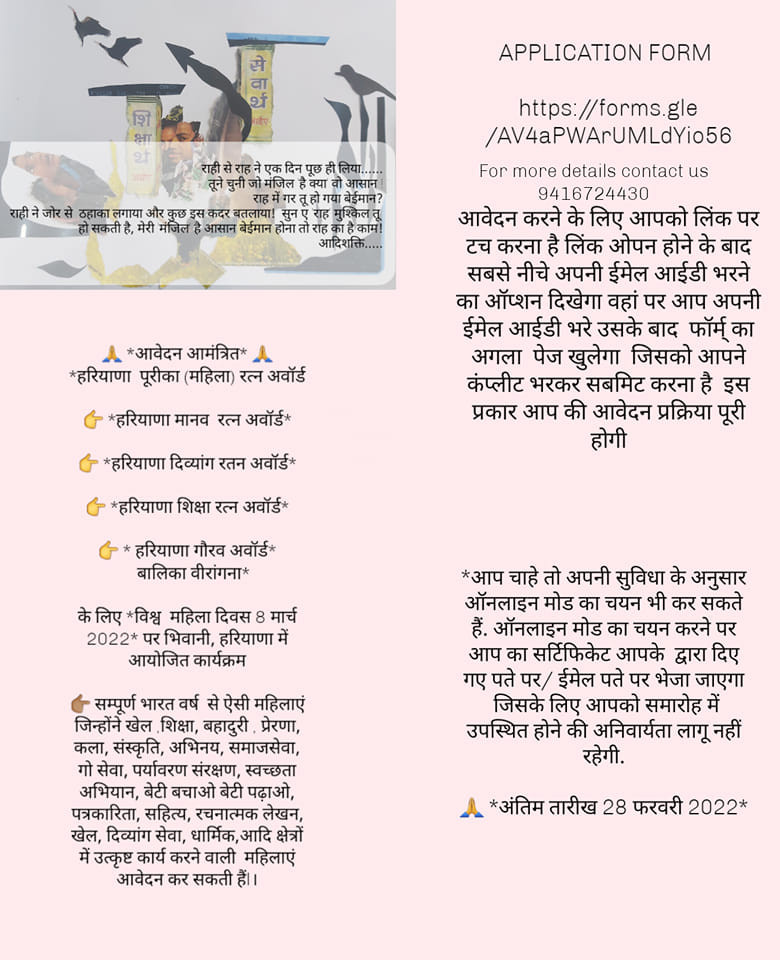 आवेदन आमंत्रित हरियाणा पूरीका (महिला) रत्न अवॉर्ड, हरियाणा मानव रत्न अवॉर्ड, हरियाणा दिव्यांग रतन अवॉर्ड